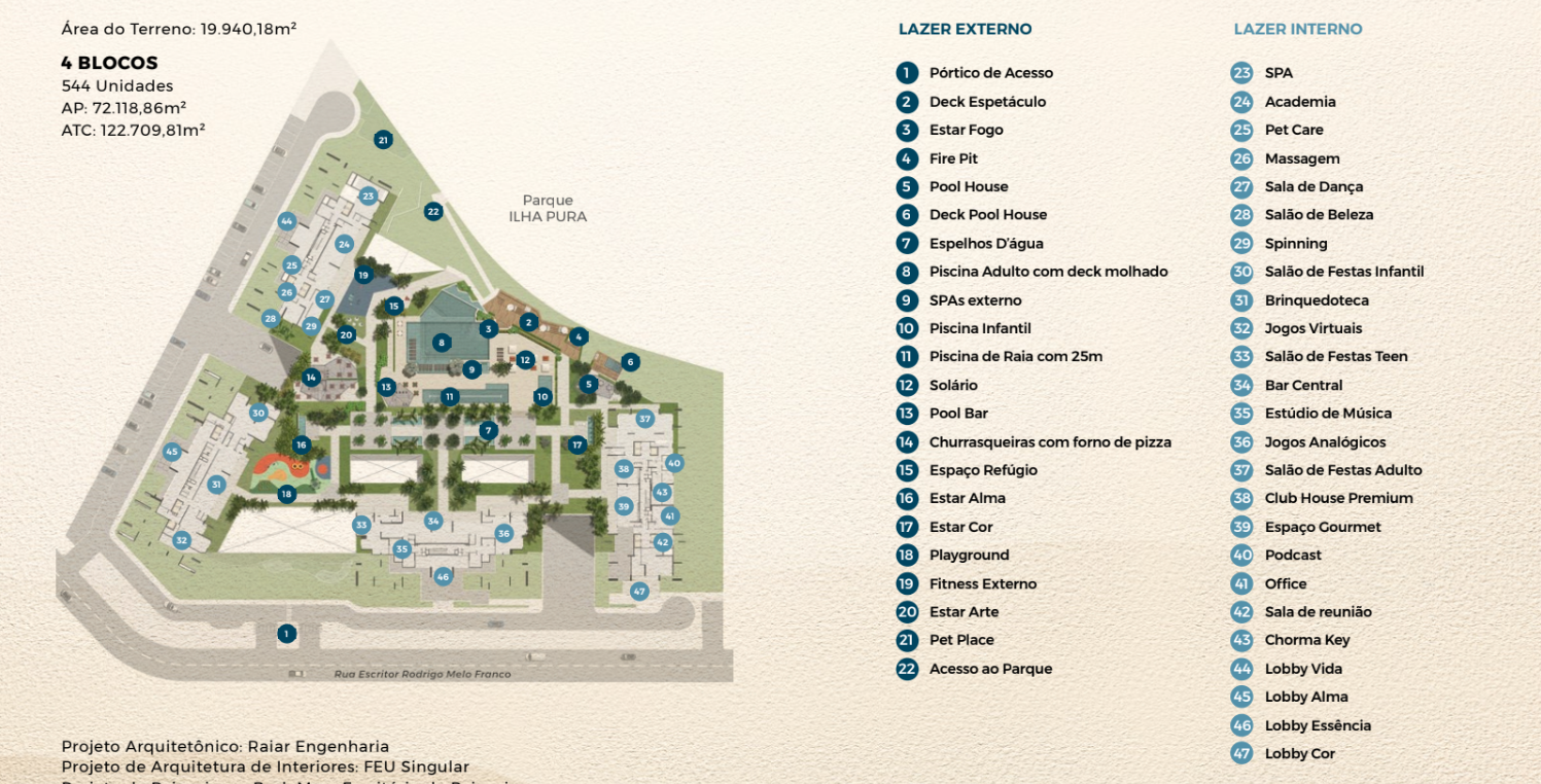 O Parque Ilha Pura tem 72 mil m2 – o equivalente a 10 campos oficiais de futebol – com paisagismo assinado pelo escritório Burle Marx, Espetáculo das Águas, ciclovia de 4 km e espaços pensados para os pets.